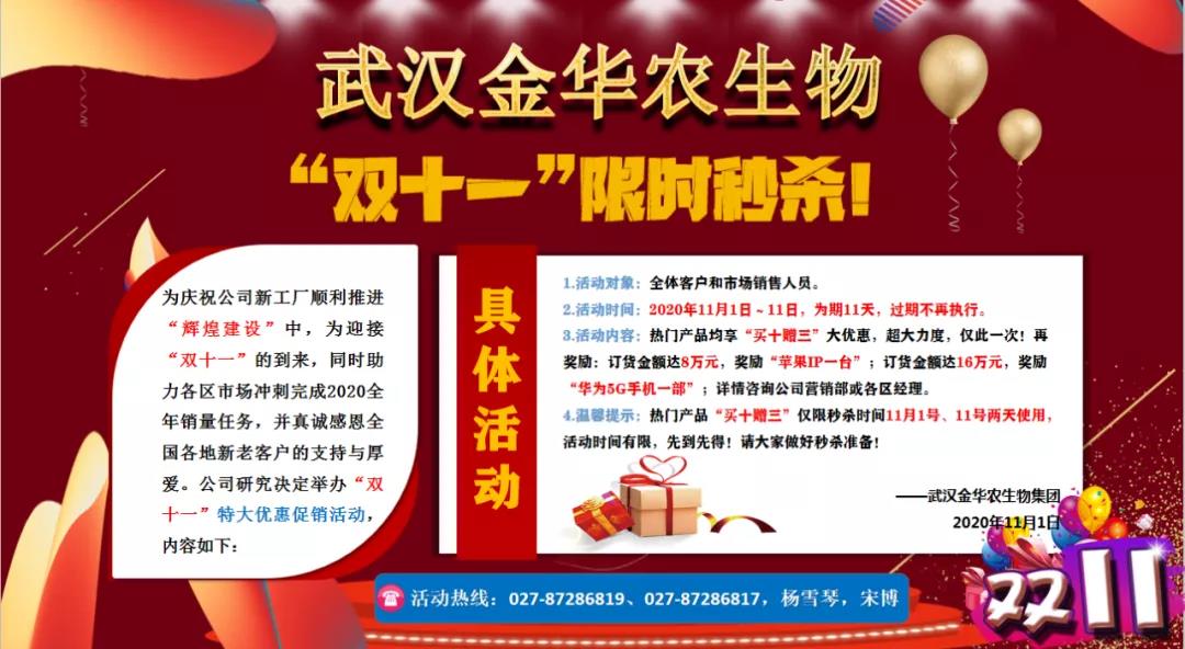 ? ? ?為慶祝公司新工廠順利推進“輝煌建設”中,為真誠感恩在這段不平凡歲月中奮戰(zhàn)在動保銷售一線的武漢金華農(nóng)同仁,為迎接“雙十一”的到來,同時助力各區(qū)市場沖刺完成2020全年銷量任務。弘揚“公司發(fā)展我成長,我為公司添光彩”,“人人爭當冠軍,人人爭當標兵”的企業(yè)文化精神,并真誠感恩全國各地新老客戶的支持與厚愛。公司研究決定舉辦“雙十一”特大優(yōu)惠促銷活動!年僅一次,超大力度!活動內容如下:? ? ?