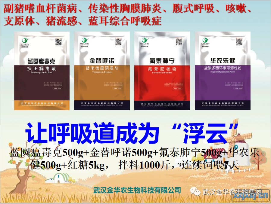 藍(lán)圓瘟毒克500 g+金替呼諾500g+氟泰肺寧500g+華農(nóng)樂(lè)500g+紅糖5kg,拌料1000斤,連續(xù)飼喂7天,對(duì)各種病毒細(xì)菌性呼吸道,效果明顯。