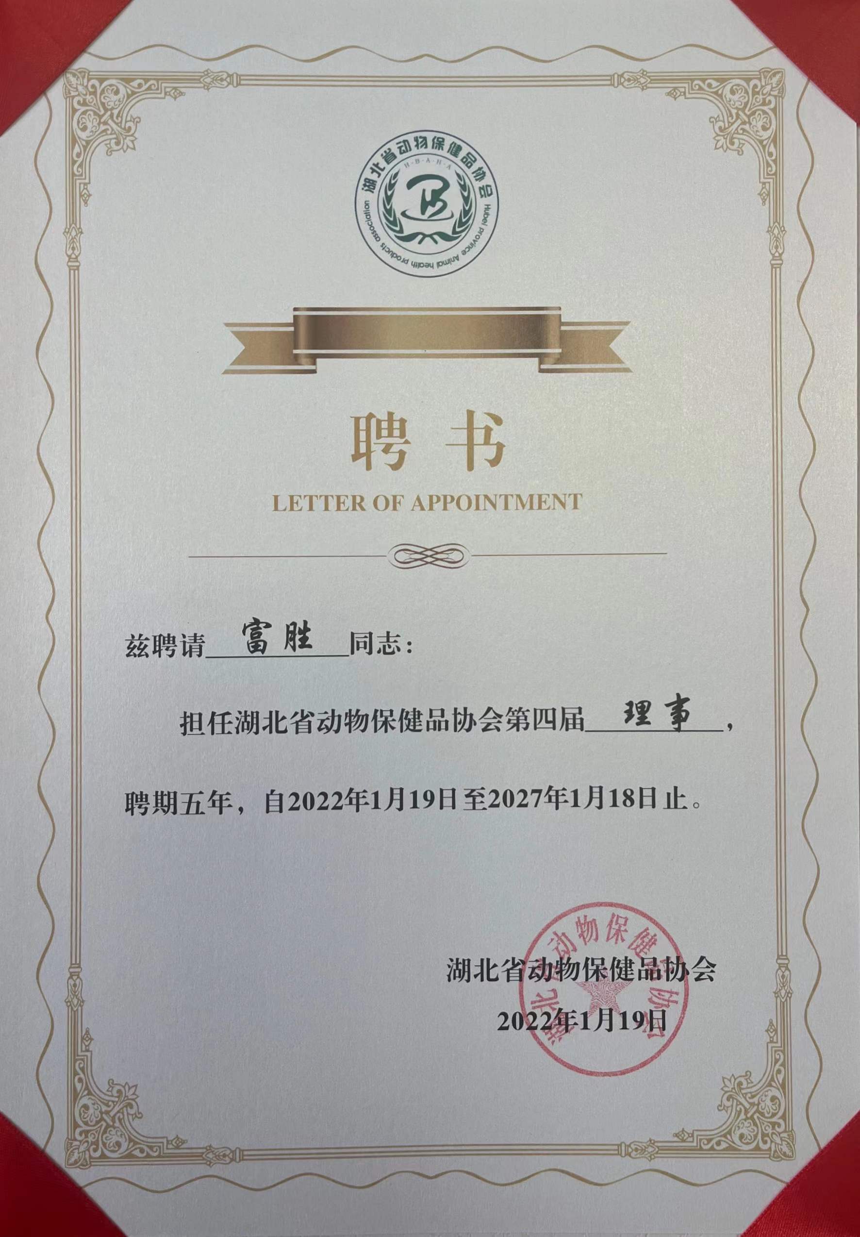 武漢金華農(nóng)榮獲“湖北省動物保健品協(xié)會理事單位”嘉獎