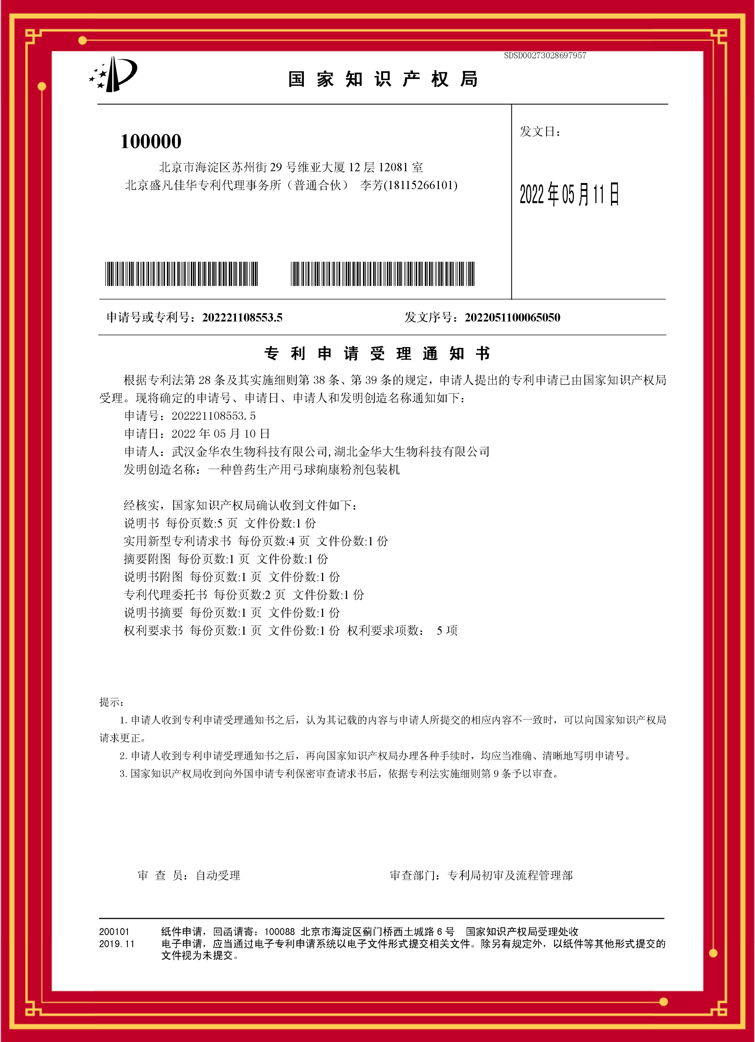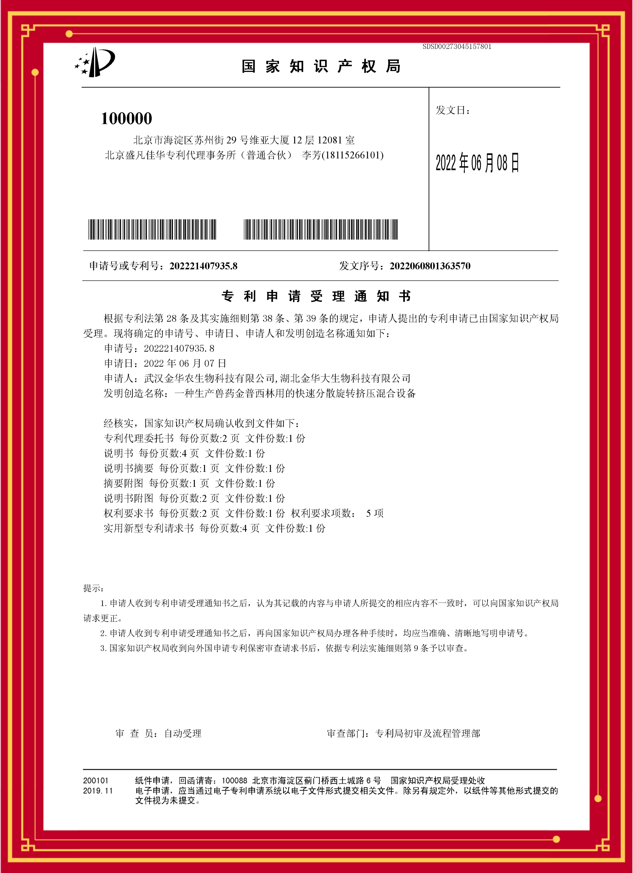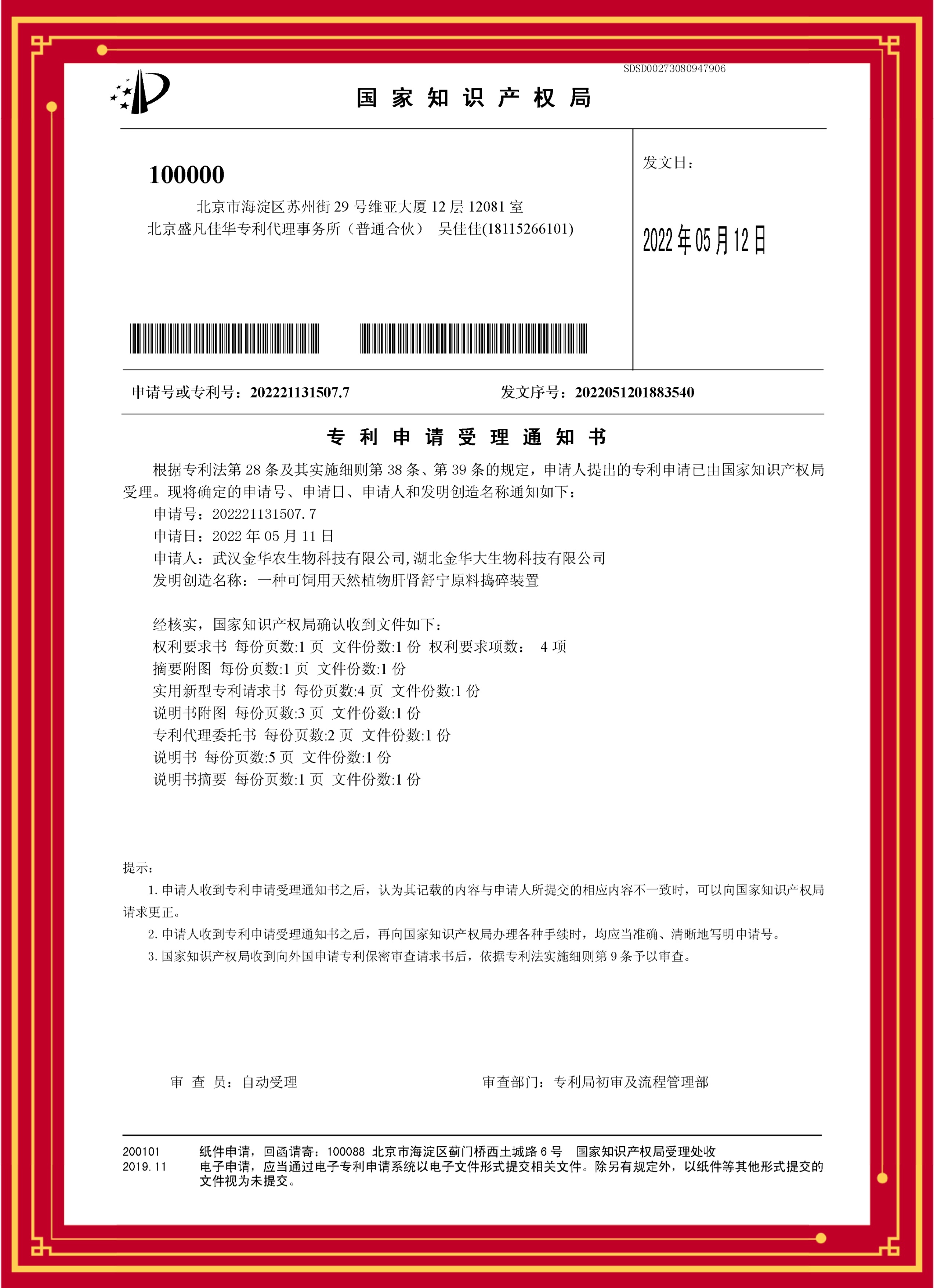 ? ? 繼“優(yōu)樂(lè)肽、快速壯、氟泰肺寧、藍(lán)圓瘟毒克、高熱病毒靈、金替呼諾”產(chǎn)品榮獲專(zhuān)利證書(shū)后,近日,武漢金華農(nóng)又一批拳頭產(chǎn)品獲得專(zhuān)利證書(shū)。產(chǎn)品“伊苯佳、黃金多維C、肝腎舒寧、弓球痢康、金普西林”5項(xiàng)目科技發(fā)明獲得國(guó)家榮譽(yù)專(zhuān)利,《一種家禽養(yǎng)殖用殺蟲(chóng)劑伊苯佳配制長(zhǎng)效裝置》,專(zhuān)利號(hào):202221076567.3;《一種用于飼料添加劑黃金多維C的輔料原料粉碎增效機(jī)構(gòu)》,專(zhuān)利號(hào):202221071292.4;《一種可飼用天然植物龍膽護(hù)肝素肝腎舒寧原料搗碎裝置》,專(zhuān)利號(hào):202221131507.7;《一種獸藥生產(chǎn)用弓球痢康粉劑包裝機(jī)》,專(zhuān)利號(hào):202221108553.5;《一種生產(chǎn)獸藥金普西林用的快速分散旋轉(zhuǎn)擠壓混合設(shè)備》,專(zhuān)利號(hào):202221407935.8,獲得國(guó)家知識(shí)產(chǎn)權(quán)局授權(quán),并獲得專(zhuān)利受理證書(shū)。