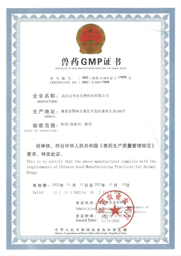 武漢金華農獸藥GMP證書號:(2022)獸藥GMP證字17038號