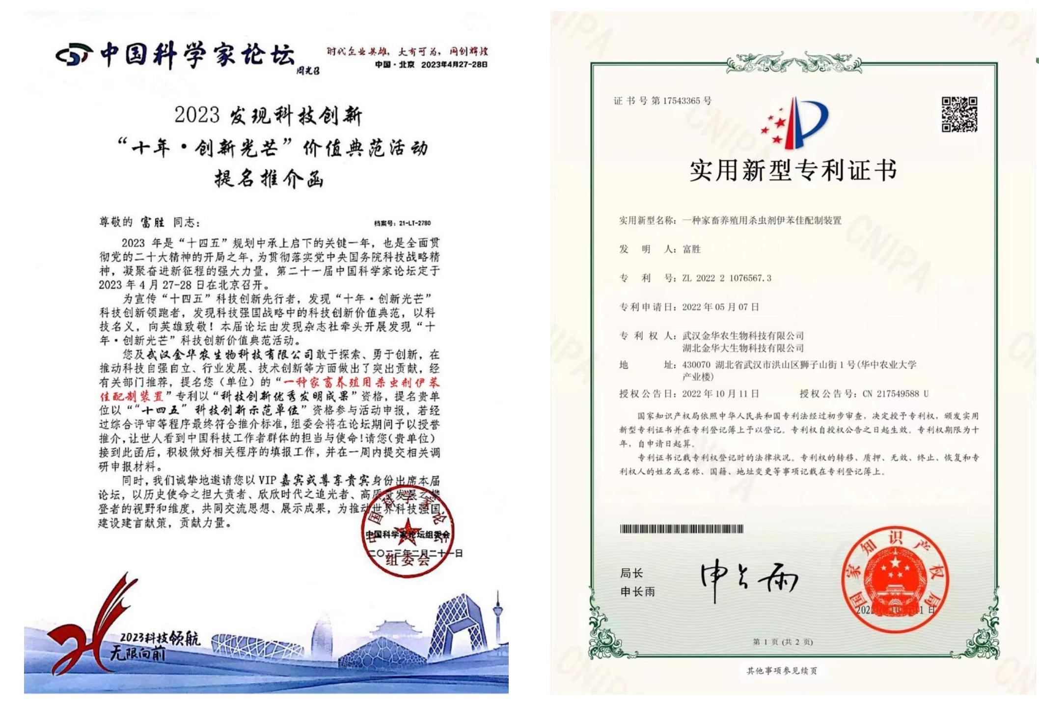 武漢金華農(nóng)生物科技有限公司在推動行業(yè)發(fā)展、科技創(chuàng)新、成果轉(zhuǎn)化等方面做出積極努力與貢獻(xiàn),經(jīng)有關(guān)部門推薦,我司一項“有效提高家畜養(yǎng)殖用殺蟲劑伊苯佳工藝配制”(專利證書字第17543365號)專利擬作為第二十一屆中國科學(xué)家論壇優(yōu)秀成果重點推介,并提名入圍“科技創(chuàng)新優(yōu)秀發(fā)明成果”。同時,我司還提名入圍“十四五”科技創(chuàng)新示范單位。