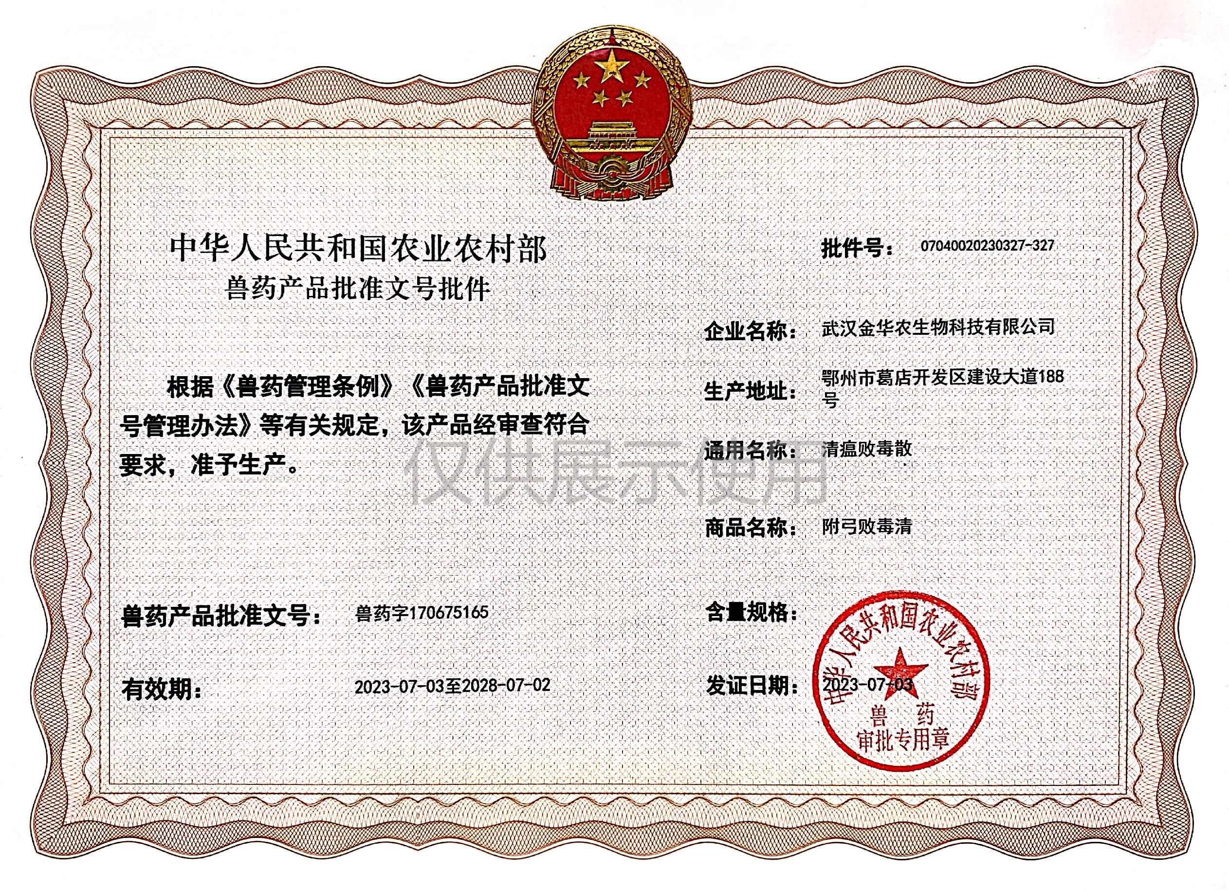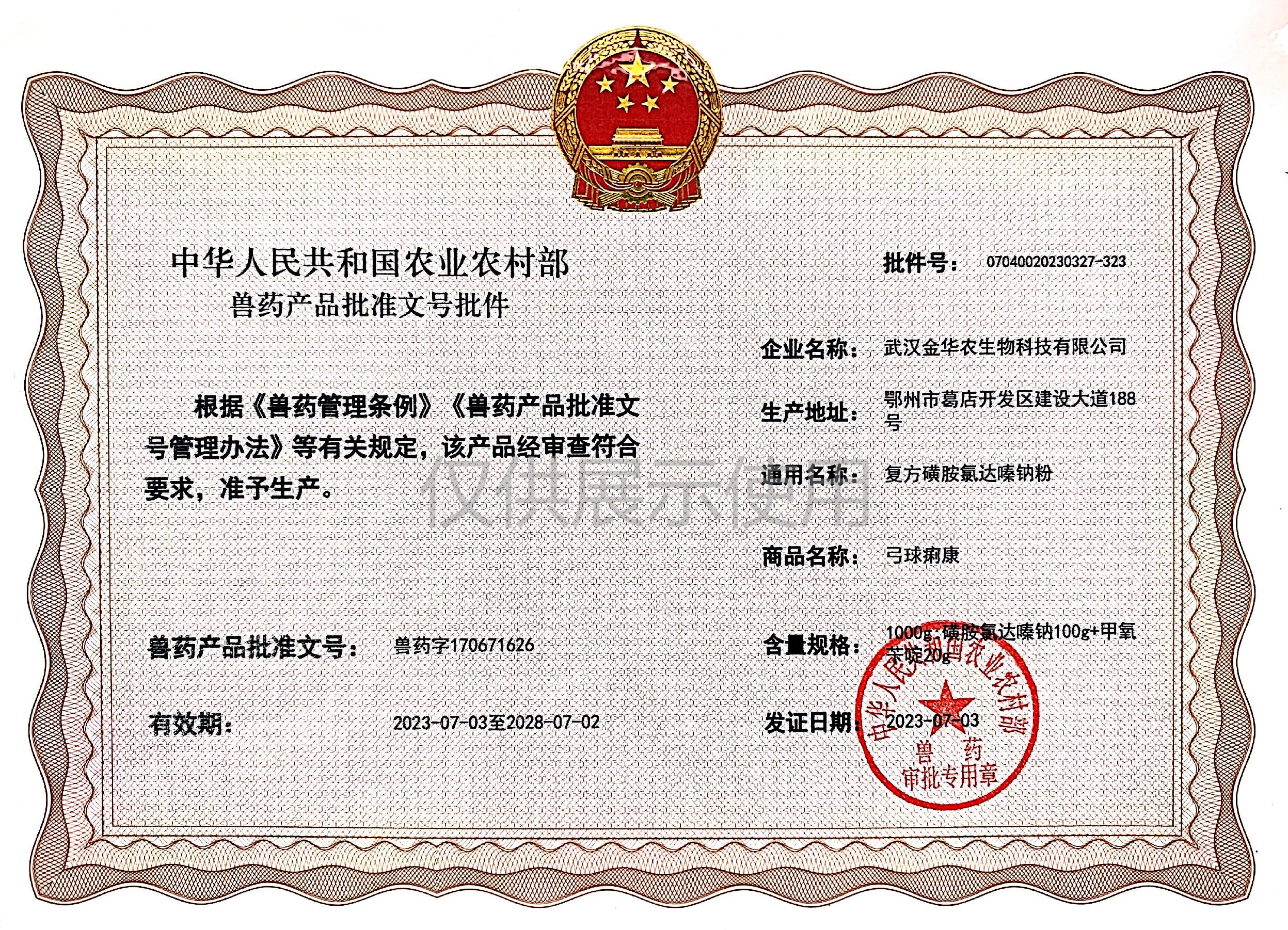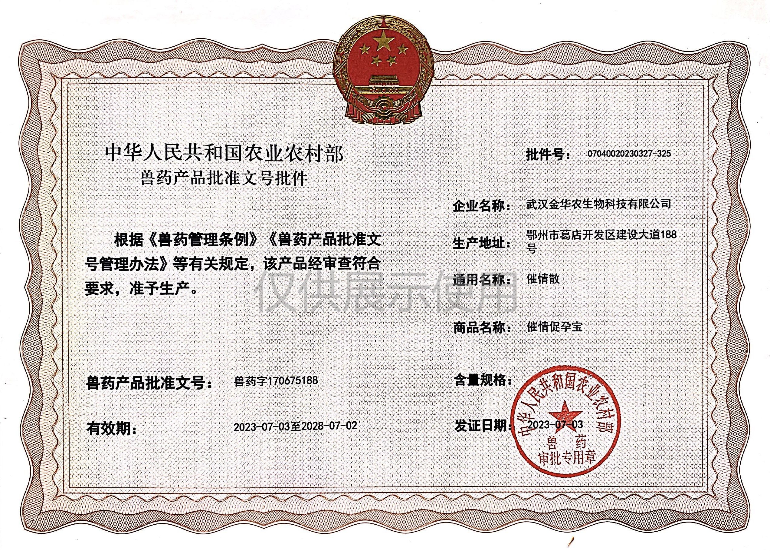 根據(jù)《獸藥管理條例》和《獸藥產(chǎn)品批準文號管理辦法》的規(guī)定,經(jīng)農(nóng)業(yè)農(nóng)村部審查,準予核發(fā)武漢金華農(nóng)生物科技有限公司(以下簡稱“武漢金華農(nóng)生物”)國家新版GMP9種獸藥相關(guān)產(chǎn)品批準文號,這是今年獲取的第三批獸藥產(chǎn)品批準文號,截至目前,我司已獲得農(nóng)業(yè)農(nóng)村部頒發(fā)的新版GMP獸藥文號20個。