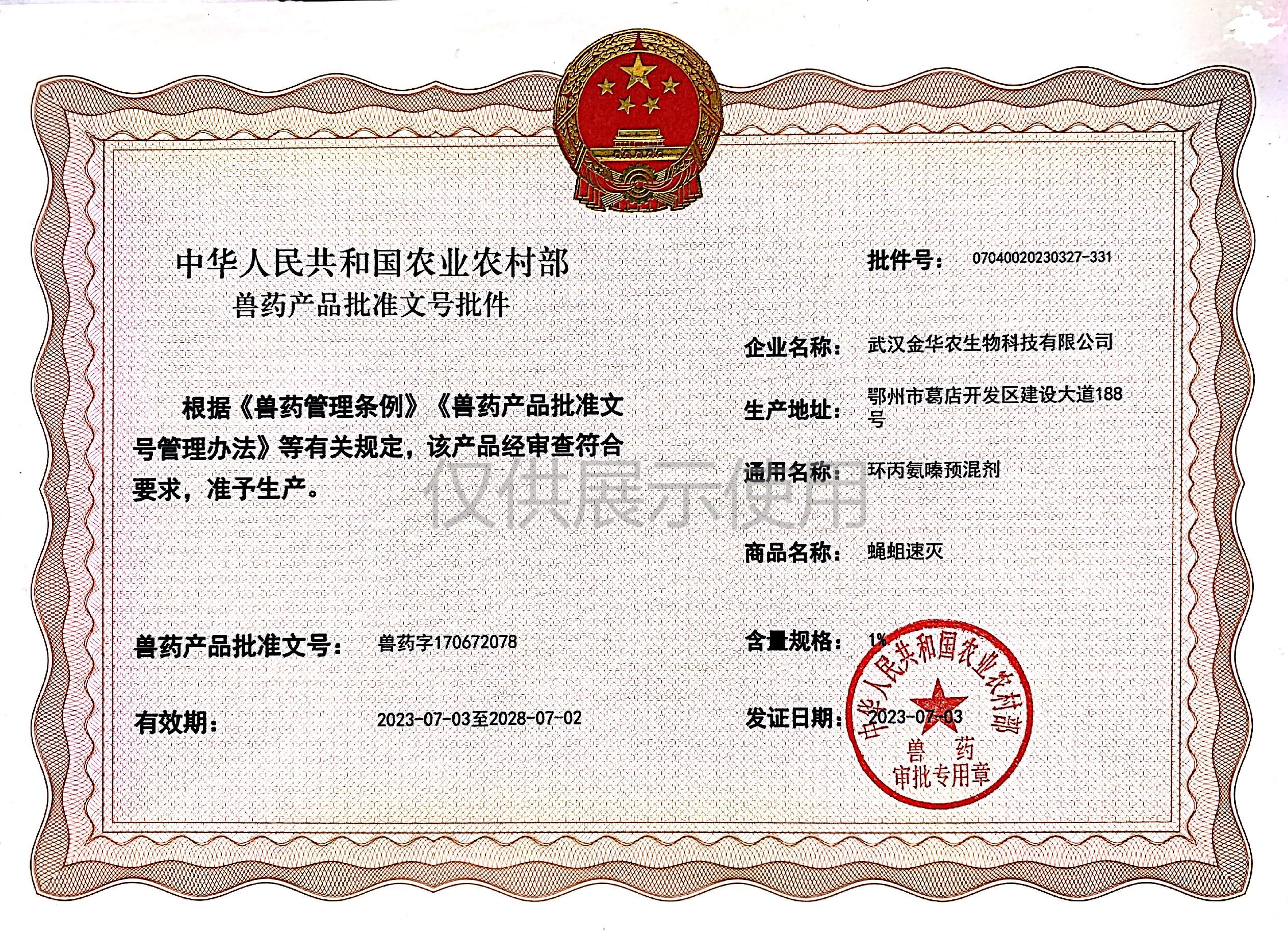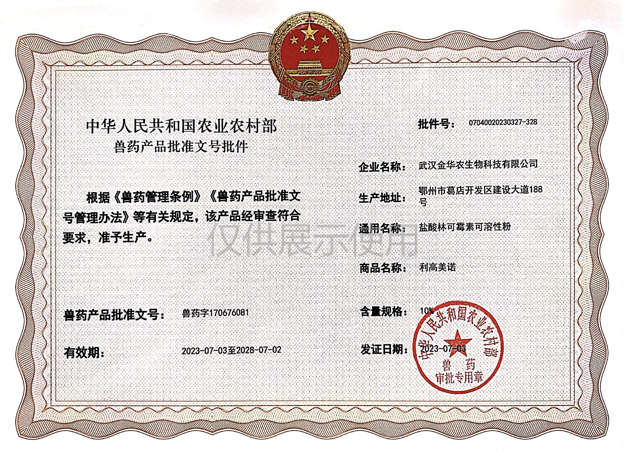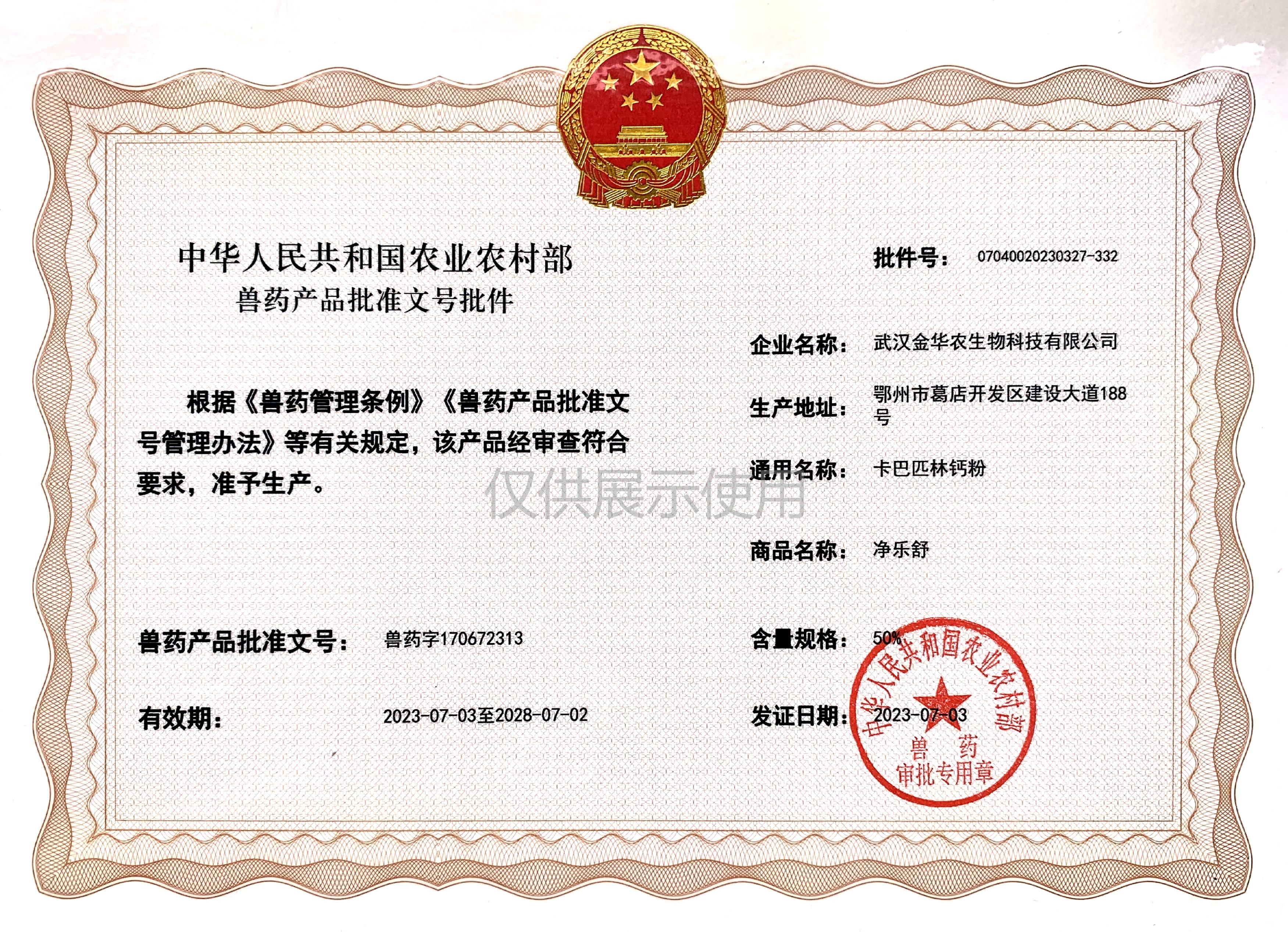 根據(jù)《獸藥管理條例》和《獸藥產(chǎn)品批準文號管理辦法》的規(guī)定,經(jīng)農(nóng)業(yè)農(nóng)村部審查,準予核發(fā)武漢金華農(nóng)生物科技有限公司(以下簡稱“武漢金華農(nóng)生物”)國家新版GMP9種獸藥相關(guān)產(chǎn)品批準文號,這是今年獲取的第三批獸藥產(chǎn)品批準文號,截至目前,我司已獲得農(nóng)業(yè)農(nóng)村部頒發(fā)的新版GMP獸藥文號20個。