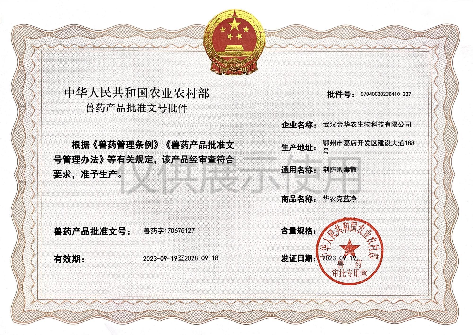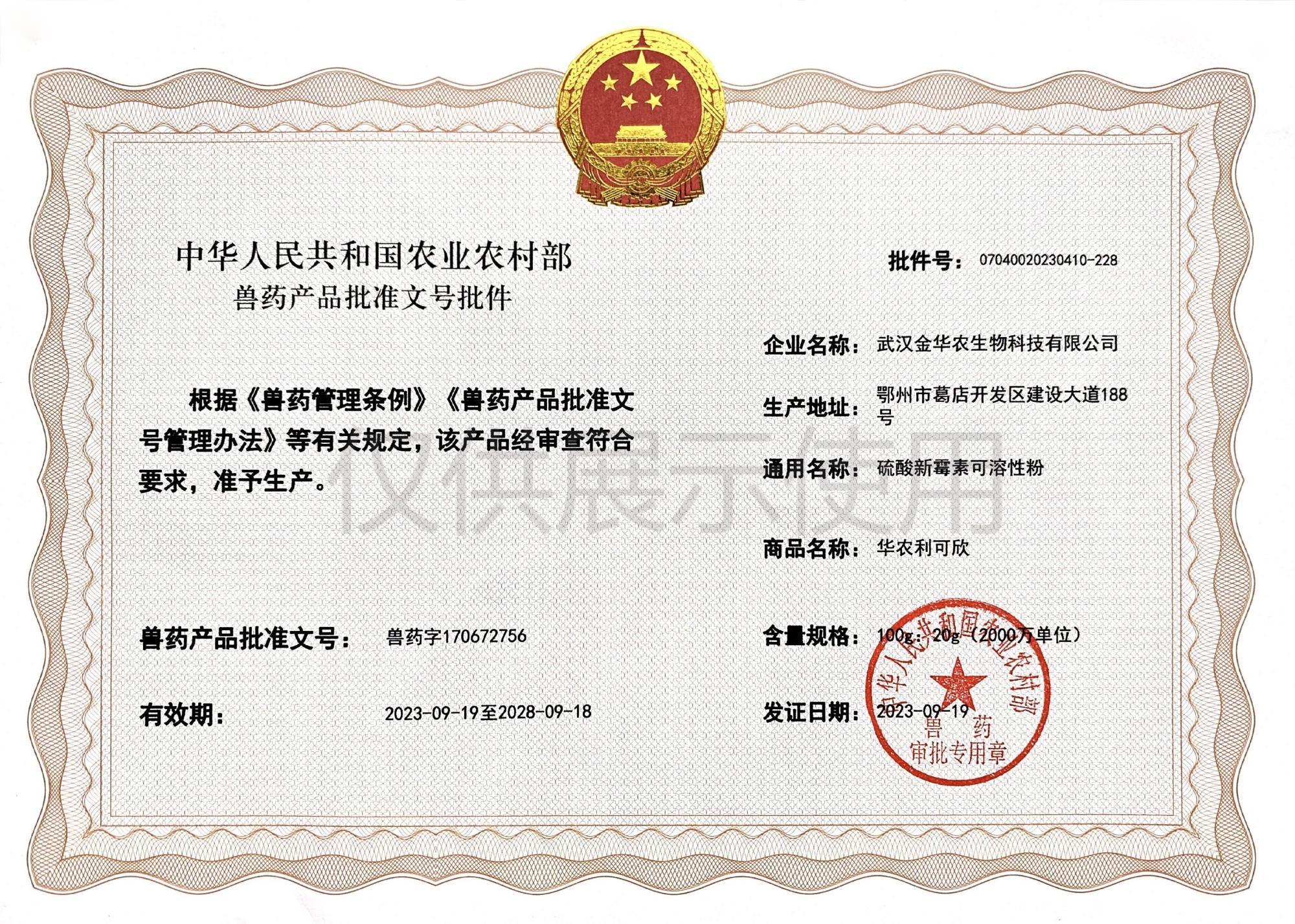 近日,我司申報的新獸藥“華農(nóng)感康靈”(荊防敗毒散)、“華農(nóng)利可欣”(20%硫酸新霉素可溶性粉)正式獲批,并獲得國農(nóng)業(yè)農(nóng)村部頒發(fā)的新獸藥產(chǎn)品批準文號批件。