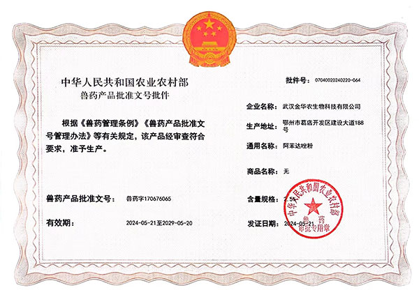 根據(jù)《獸藥管理?xiàng)l例》和《獸藥產(chǎn)品批準(zhǔn)文號(hào)管理辦法》的規(guī)定,經(jīng)農(nóng)業(yè)農(nóng)村部審查,準(zhǔn)予核發(fā)武漢金華農(nóng)生物科技有限公司4個(gè)新版GMP獸藥相關(guān)產(chǎn)品批準(zhǔn)文號(hào)。