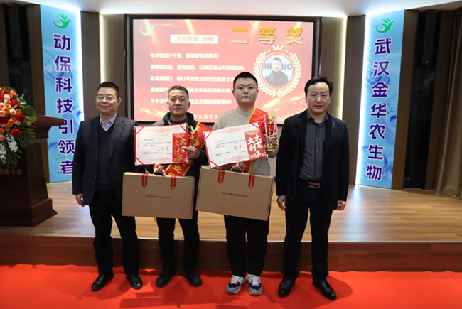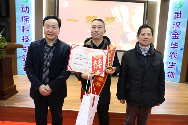 頒獎嘉賓:武漢金華農生物集團董事長富勝、武漢大學商學院戰(zhàn)略研究院導師徐偉、武漢金華農運營部總監(jiān)郭昌盛