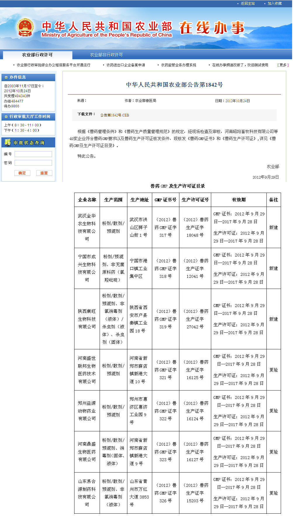 國(guó)家農(nóng)業(yè)部第1842號(hào)公告:武漢金華農(nóng)生物新廠區(qū)榮獲獸藥研發(fā)生產(chǎn)資質(zhì)