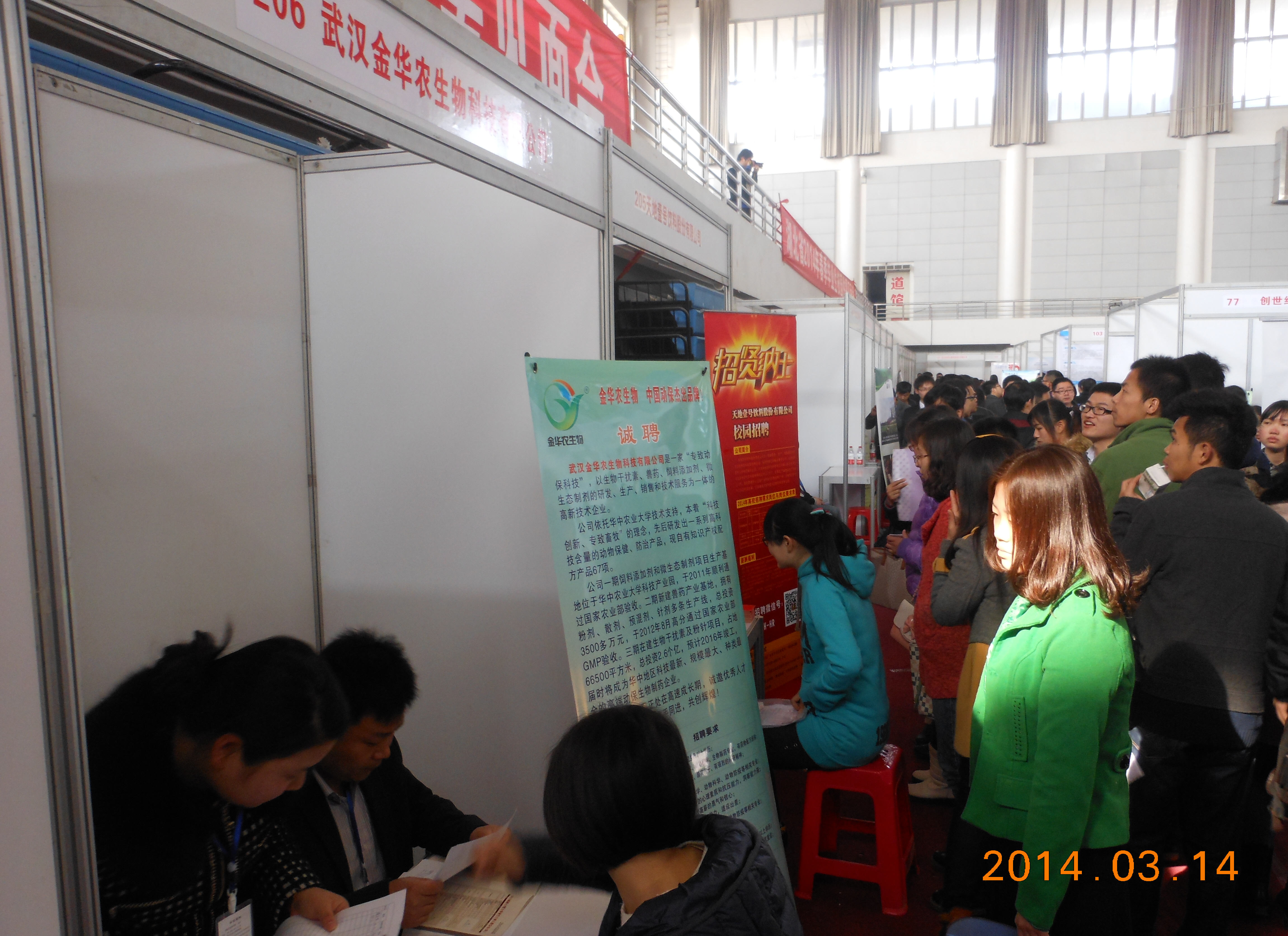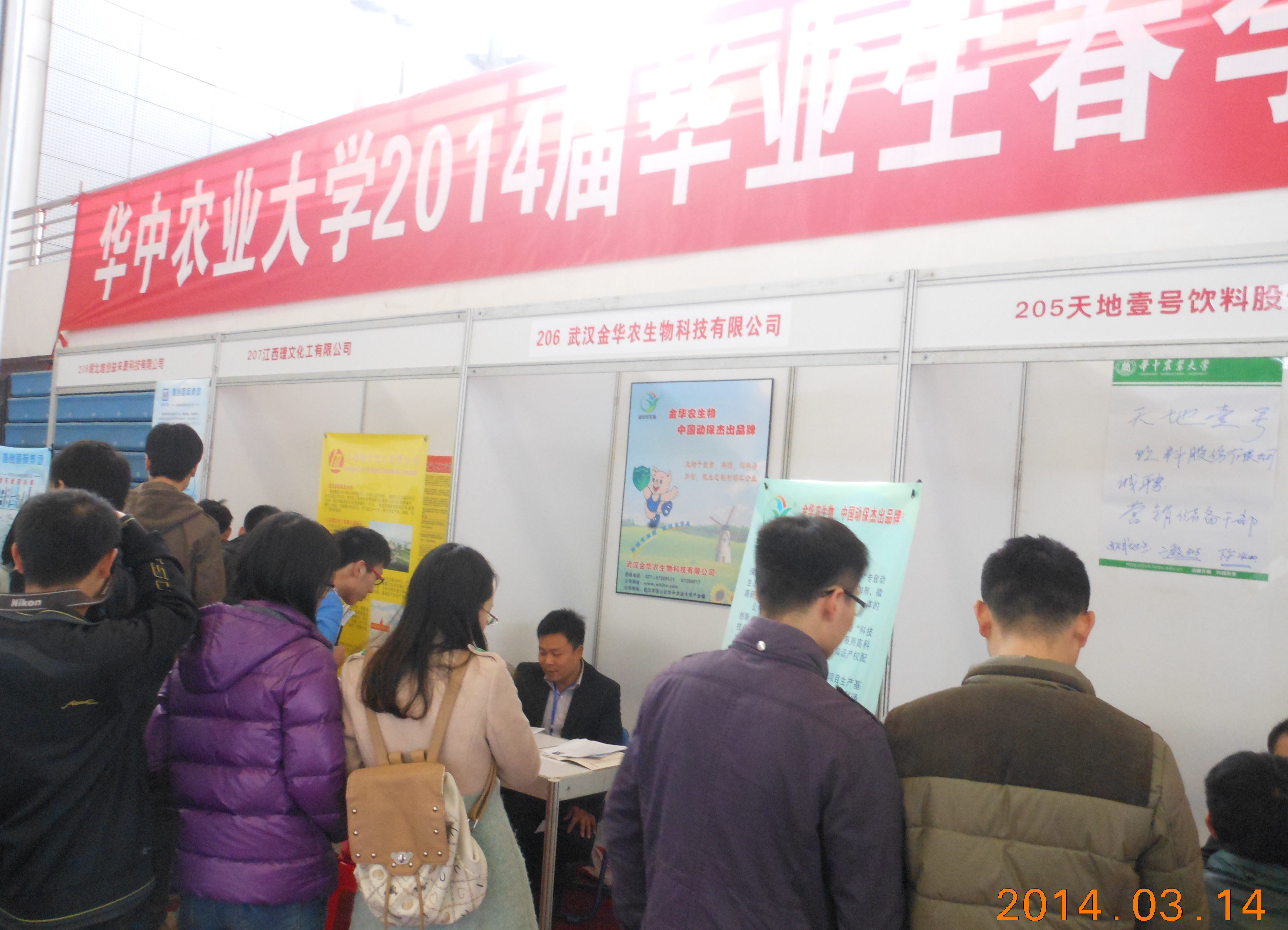 14日,華中農(nóng)業(yè)大學(xué)舉行2014屆畢業(yè)生春季供需見面會(huì),4850余名來(lái)自該校及附近高校的畢業(yè)生參加了現(xiàn)場(chǎng)見面會(huì) 。應(yīng)華中農(nóng)業(yè)大學(xué)學(xué)生工作處、華中農(nóng)業(yè)大學(xué)科技處的邀請(qǐng),武漢金華農(nóng)生物隆重出席了此次招聘會(huì),為公司的高速發(fā)展再次招攬優(yōu)秀人才。