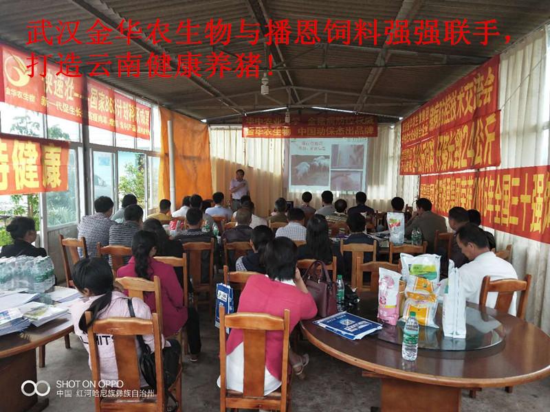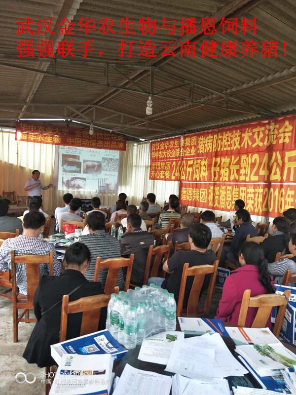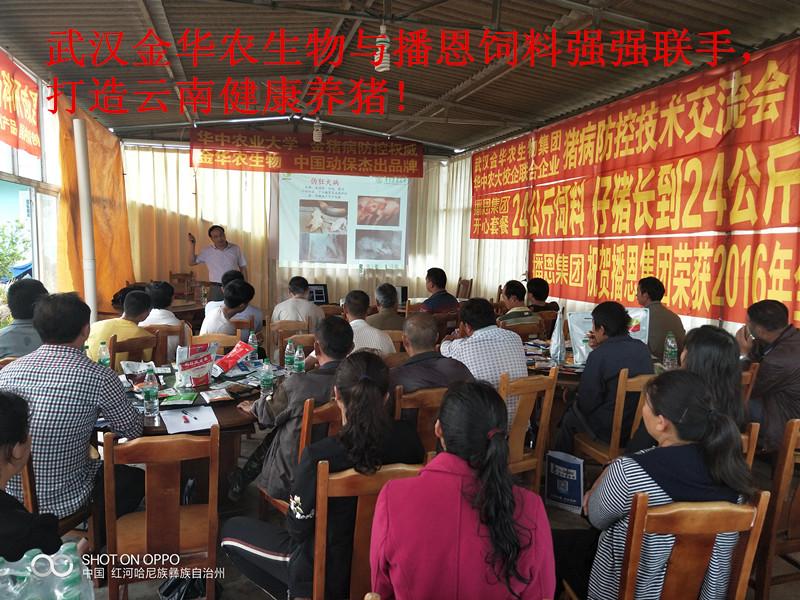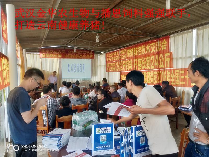 2018年6月25日,武漢金華農生物制藥與云南播恩飼料集團,強強聯(lián)手,戰(zhàn)略互信,友好合作,互惠雙贏,服務廣大省內畜牧養(yǎng)豬戶,打造云南健康養(yǎng)豬生態(tài)產業(yè)鏈第一品牌!武漢金華農生物集團聯(lián)合華中農業(yè)大學豬病權威專家教授,結合云南養(yǎng)豬地域性的實際情況,于本月25日、28日、30日,連續(xù)舉辦3場送“科技下鄉(xiāng)豬病研討會”,打造云南養(yǎng)豬特色服務產業(yè)生態(tài)鏈條,為廣大養(yǎng)豬戶排憂解難,為廣大養(yǎng)豬戶保駕護航!