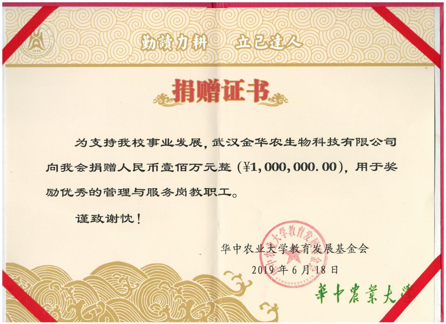 華中農(nóng)業(yè)大學(xué)向武漢金華農(nóng)生物頒發(fā)捐贈(zèng)證書